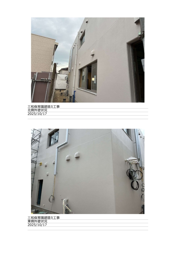 内部では、電気・設備業者が天井内配線・配管を行い、外部では、RF屋上防水下地(左官工事)、外壁塗装下地(左官工事)を行っています。