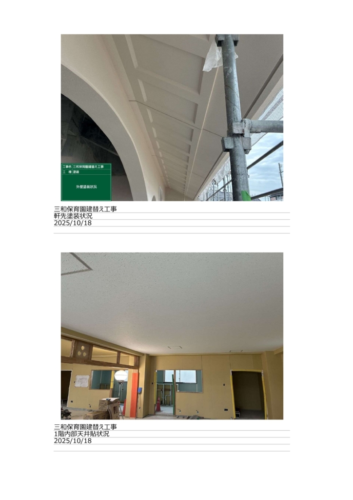 外装工事では、屋上防水・外部吹付け塗装を継続施工し、内装工事では、間仕切り壁ボード貼り・天井下地組を施工中です。