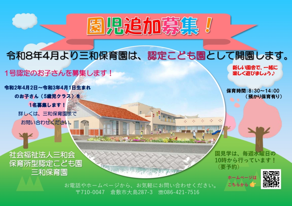 令和8年4月より保育所型認定こども園移行に伴い、1号認定のお子様を9名募集していましたが、5歳児クラス1名の園児を追加募集させていただきます。ご希望の方は、保育園まで直接お問合せください。