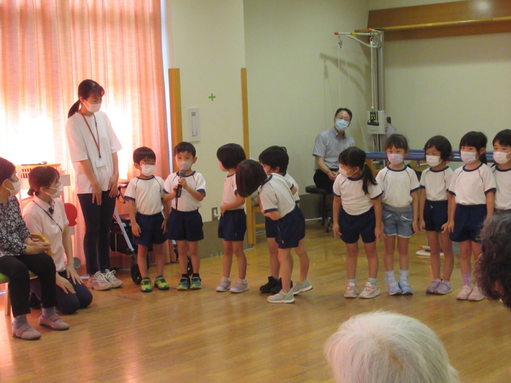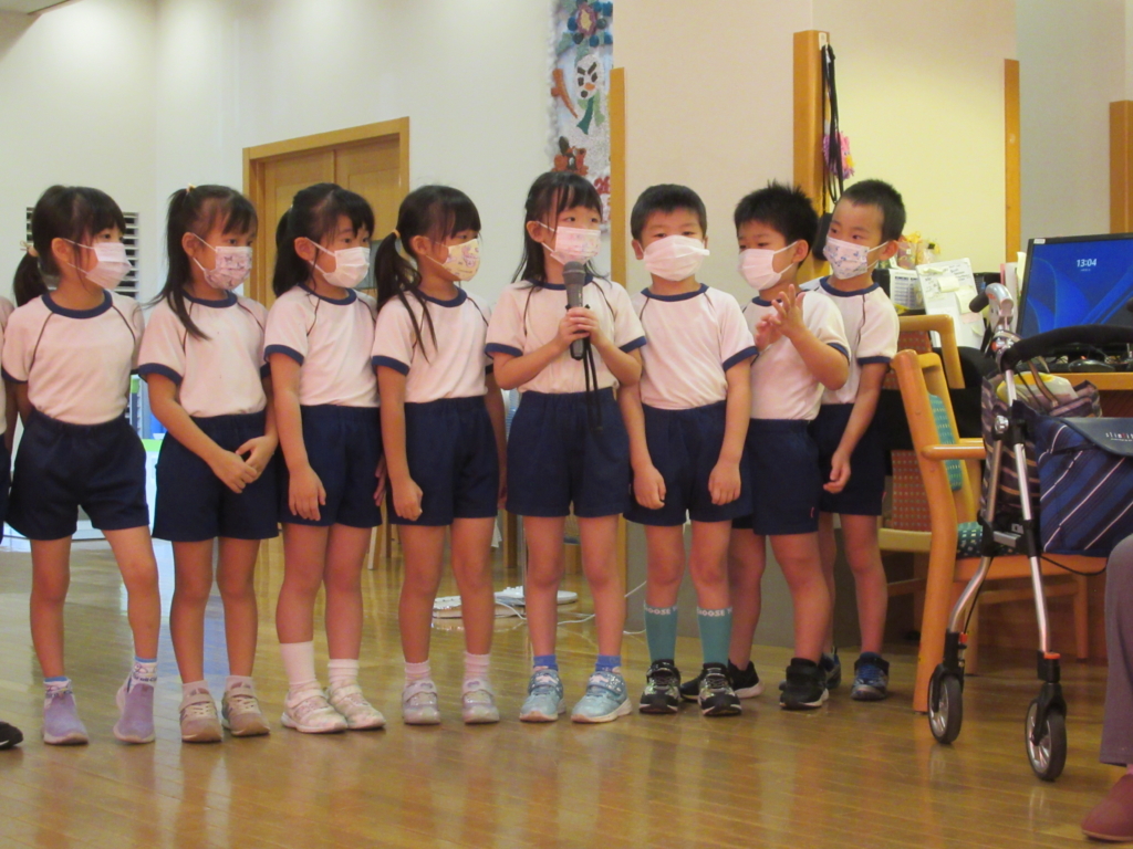 初めての慰問にドキドキで緊張気味の子ども達でしたが、一人ずつ名前と好きな食べ物を発表したり、「世界がひとつになるまで」の歌を披露したりと、年長組らしく元気な姿を見てもらうことができました✨