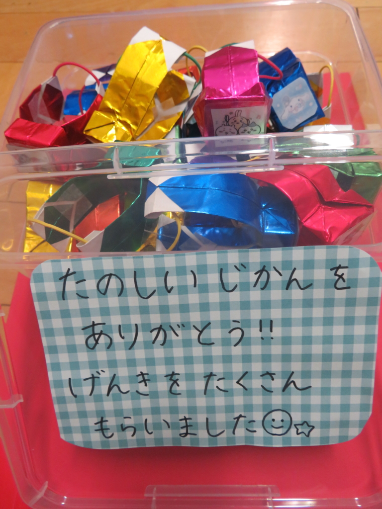 おじいちゃん、おばあちゃん方からは、折り紙で作ったブレスレットをプレゼントしてもらいました。子ども達が大好きなキャラクターがついていて、「どれにしようかな💓」と、喜んで選んでいました。